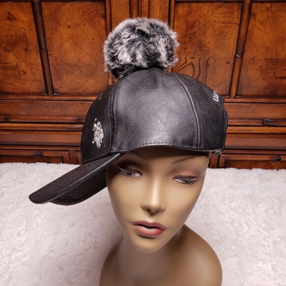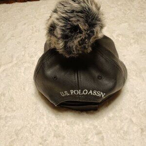 Vtg Y2K U.S. Polo Assn Black Faux Leather Cap Hat Pom Pom Adjustable Strap