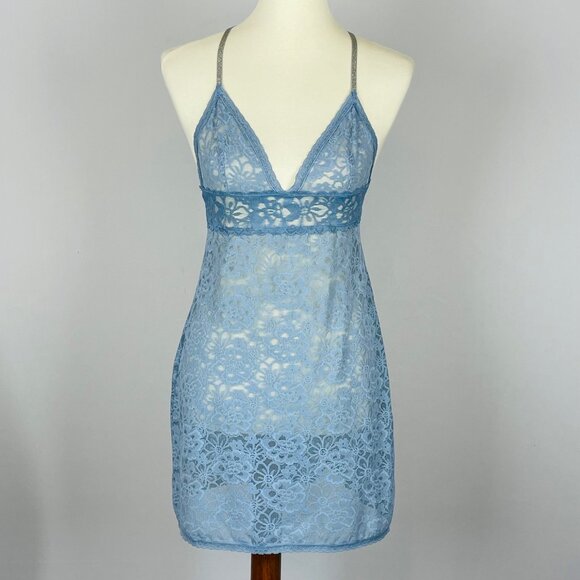 Vtg Y2K Victorias Secret Lace Babydoll Mini Slip Dress XS Blue Fairy Coquette