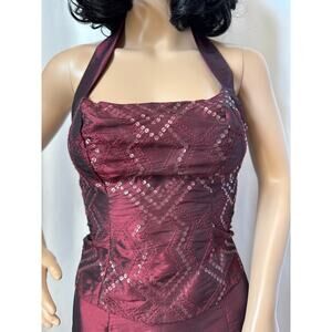 Zum Zum By Niki Livas Taffeta two piece set Halter neck top and matching long maxi skirt. A lovely rich burgundy Color with clear sequins on the top. Top has a zipper all down the back that opens completely, halter strap goes around neckline with hook and eye closure at the back