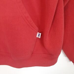 Show off your Buckeyes pride with this vintage Russell Athletic hoodie featuring the iconic Ohio State Buckeyes University logo. Made from a comfortable blend of polyester and cotton, this red hoodie is perfect for all seasons and activities, including gym and training, walking, basketball, football, and hiking. The pullover style hoodie comes in a men's size M and has a solid pattern with the Buckeyes logo prominently displayed on the front.