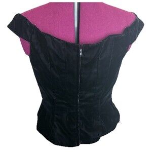 This vintage two-piece dress set from the Y2K era is perfect for any formal occasion, whether it be a prom, wedding or a cocktail party. The dress features a beautiful floral pattern on the skirt with velvet floral details. The velvet corset top features a scoop neckline and a sleeveless, off the shoulder design. The lightweight fabric is made of polyester, rayon, and acetate, and the dress is handmade with a corset and pleated accents.