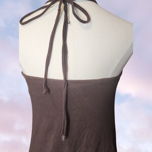 Vtg Vintage Y2k Moda Intl Brown Mini Short Beach Cover Up Preppy Chic Boho Hippie Surfer Fairy Halter Dress Top. This piece has wood chunky beads along the front of the straps for decoration. There is ruching in front and along the bottom sides. The halter straps tie in back and are fully adjustable. This piece would be great layered over some tights and a puffy warm coat worn with chunky fur boots. Or worn in the warmer weather as a bathing suit cover up.