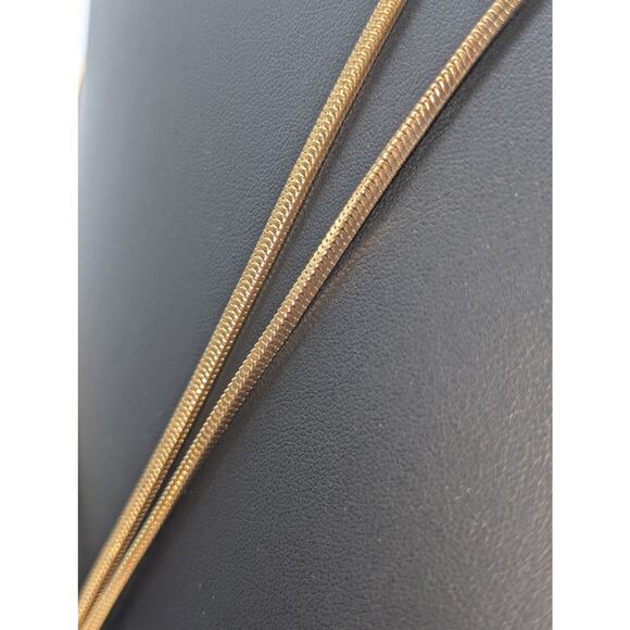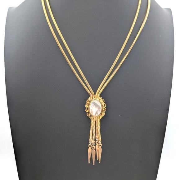 Vtg Yellow Gold Plated Double Snake Chain MOP Glass Tassel 17"-20.5" Necklace. Pre-owned, this lovely necklace is in excellent vintage condition. Hook clasp. Bolo style. Really nice vintage piece.