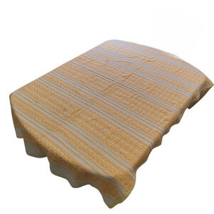 Made of soft cotton or a cotton blend, it’s finished with yellow double-fold bias binding and clean mitered corners.