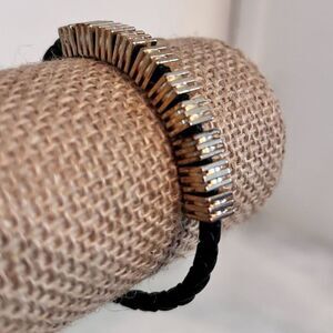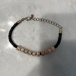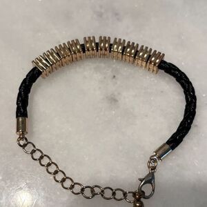 This vintage Zara bracelet features a stylish black braided rope leather cord with a partial wrap design, accented by linked gold-tone square discs for a modern touch. The bracelet is adjustable, secured with a lobster clasp closure, and finished with gold-tone end caps, combining elegance and versatility for any outfit.