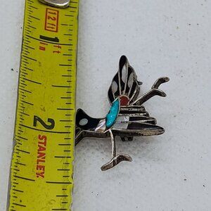 Vtg Zuni Inlay Roadrunner Brooch Pin Silver Onyx Turquoise Coral Mother O Pearl