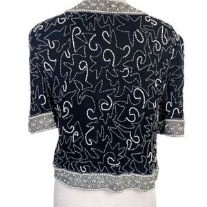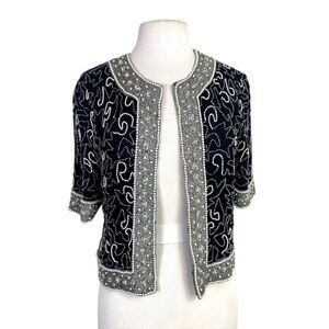 A vintage Laurence Kazar 100% silk cropped jacket with hand sewn beads and sequins. This would look great with a sexy little cami underneath or a bralett. Add some silver jeweley and you are the star ! This is in good condition. All of the beads are intact . I'm a size 8 and it fits me pretty good. It would fit a size 10 as well. please check the measurements and feel free to send me questions.