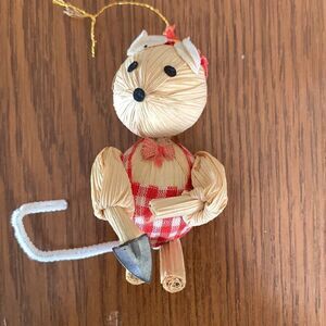 Vintage corn cob mouse with trowel in hand & pipe cleaner tail Christmas tree ornament