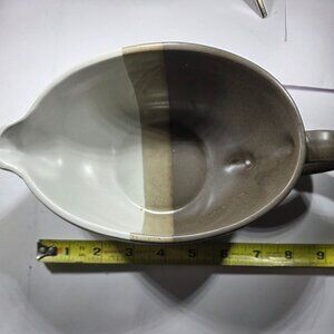 This ceramic gravy boat features a stripe design in brown and cream tones. It includes a handle for sturdy grip and a spout for controlled pouring.