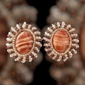 Stunning pair of banded agate cabs on Carmel and beige, beautiful stones worn borders of ab copper and ab crystal glass beads. These were made by Sonoma jewelry designer Lisa Jo Silberkleit, I will include her artist statement. These are vintage new old stock, the pierced earrings have suede backs snd measure 1.25 “ x 1”. Please see all photos for full description.