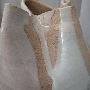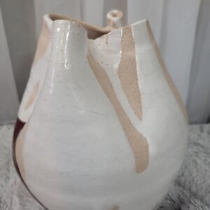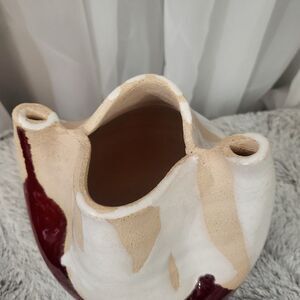 Vtg handmade pottery signed Claire '92 peach color with white & red drip glaze