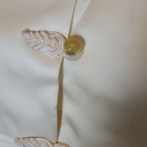 Vintage heavy bridal satin evening jacket, oriental styling with mandarin collar and frog closure, kimono sleeves. Jacket is fully lined. Short sleeves, sequin & braid trim. Will need to be steamed. Note some flaws, examples shown. Guessing 50's 60's style, no tags, so likely hand made.