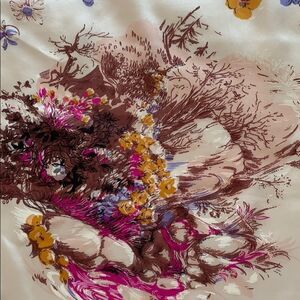 Beautiful vintage scarf in silk satin with hand rolled edges. Mid century design of multiple land scales. Unusual collectible scarf in good vintage condition.