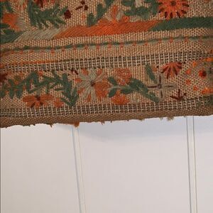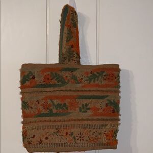 Vintage late 60s/early 70s burlap bag with orange & green floral yarn design