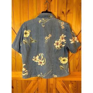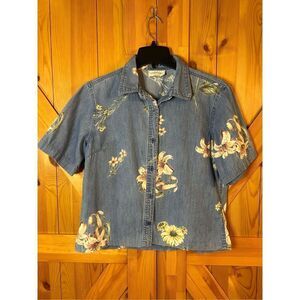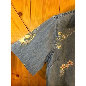 Vtg lemon grass floral denim button front shirt 90s Y2K boho cottagecore Size medium short sleeve No size tag please check the measurements pit to pit 21”length 22” (0481)