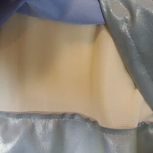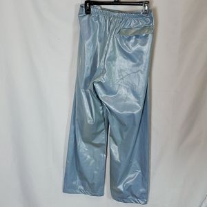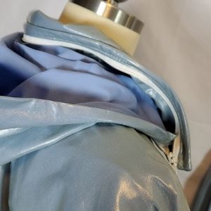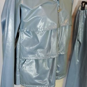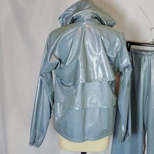 Vintage light blue shiny Duckster 2 pc track suit. Jacket has a zip front, attached hood (can be zipped into collar), layers of ruffles, & pockets. The pants have an elastic back and flexible hook & loop front closure. Fabric feels like it would be rain resistant. Note glue (?) residue along seam line in pants. Jacket has mesh lining. Est circa 80s 90s