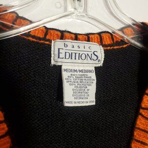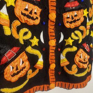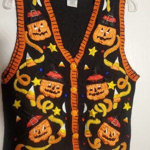 Vintage Basic Editions size medium knit cotton Halloween Vest. Vest features witchy pumpkins with some beading and embroidered embellishments. Lay flat measurements are 18" across the waist as well as the armpits, and 23" shoulder to waist.