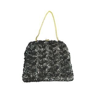 Vtg mini Black Beaded purse, kisslock gold tone chain- Intricate Vine Design