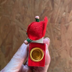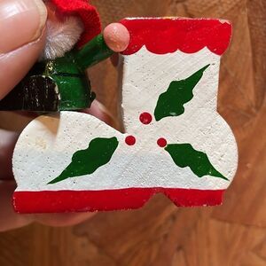 Vintage painted wooden elf with red felt hat & beard sitting on toe of Christmas boot candle holder