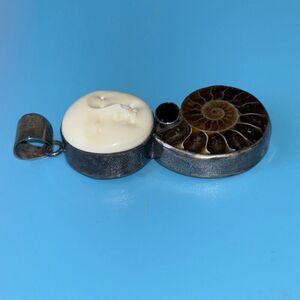 Vintage silver pendant with cream stone moon goddess face and ammonite snail fossil