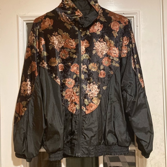 Super cute girly goth windbreaker. The floral portion is velvet and the black is classic windbreaker nylon. Size is XL, but could be worn oversized by a smaller size.