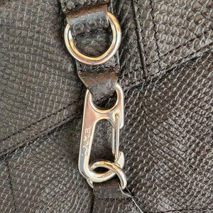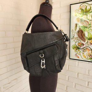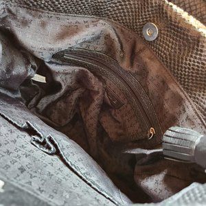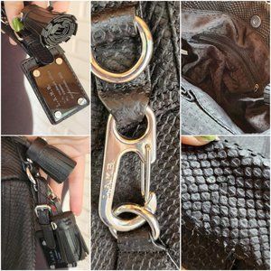 Vtg 2003 y2k streetwear avant garde futuristic purse. Has metal details. Gwen Stephani brand Black leather shaped into animal scales texture. Good condition, with some wear on the bottom!