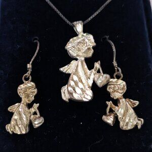 Vtg.1997 925 Sterling Silver Etched Angels Necklace & Dangle Pierced Earrings