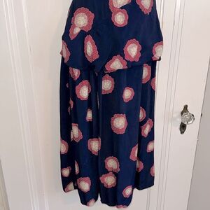 Vintage late 40s/early 50s A Debutante Original Navy Blue Fitted Cap Sleeve Thin Dress With Pink & Cream Floral Print Front Peplum