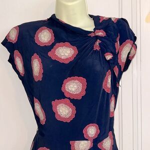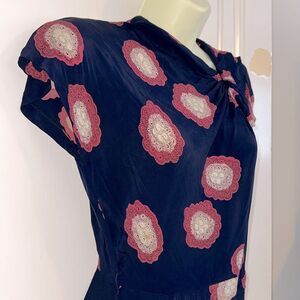 Vtg 40s/50s Navy Blue Fitted Cap Sleeve Dress With Pink & Cream Floral Print