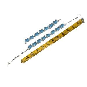 This vintage 1950’s/60’s robin’s egg pale blue & silver tone necklace & bracelet set. A crystal & leaf motif surround each triangular bead. I also like the bracelet added to necklace- see photo. The necklace is 15 inches. Stunning! Euc