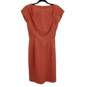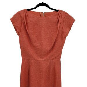 Orange coral textured silver metallic threading short sleeve scoop neck shoulder pleating draped blouson tea length sheath dress fully lined with metal back zipper entry by Elegant Miss of California.