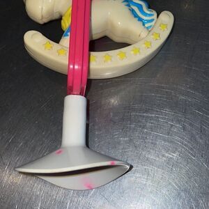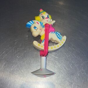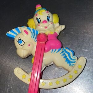 Vintage 60s or 70s plastic pink, blue, & yellow clown on a rocking horse rattle suction cup baby toy