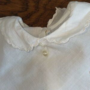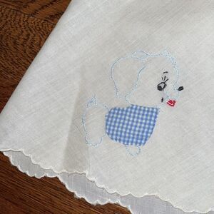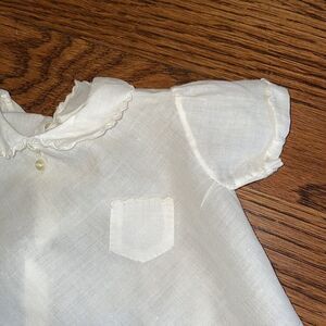 Vintage 60s white cotton lawn infant girl top with embroidered light blue dog on front and scalloped collar, hem, cuffs & pocket