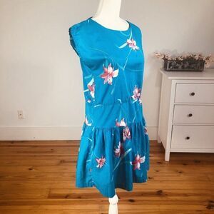 Vintage lightweight Hawaiian cotton floral mini dress. Wide band around the hips, short gathered flared skirt. Turquoise with pink and white flowers. Super cute, vacation beach dress. Small. No holes or rips. Small yellowish mark on fabric shown in photo.** stitching is pulling in one spot on the skirt. Hasn’t broken loose but you can see the stitching.