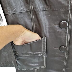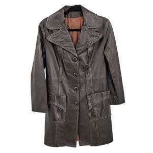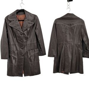 Vtg 70's Womens Leather Trench Coat Cowgirl Western Contrast Stitching Brown S