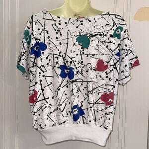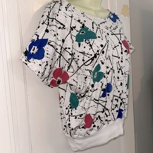 Vintage late 70s/early 80s Jessica Scott Floral Print (pinkish red, green & blue)Black Paint Splatter Print Cap Sleeve Knit Top with ribbed Fitted Stretch Hem