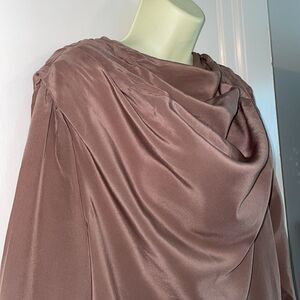 Vintage late 70s/early 80s Jerri Sherman taupe (brown)pleated shoulder drape neck long sleeved silk blouse
