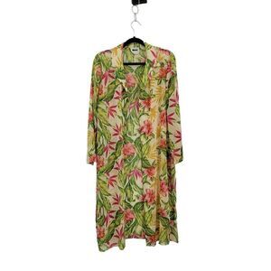 Vintage 70's sheer notch collar long sleeve clear pearl button down double high side slits coconut girl Hawaiian beach resort cruise vacation pale yellow pink lily duster swimsuit coverup by Leslie Fay. Matching midi sheath dress available separately.