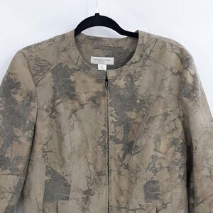 Vintage 80's green hunter camouflage print with metallic gold fully lined jewel neck collar zip up long sleeve jacket with slit pockets by Christopher & Banks.