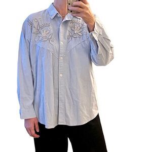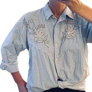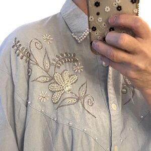 Vtg 80s Blue Button Down Pearl Floral Embellished Chambray Oversized Shirt 1X