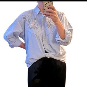 Vintage 80s Jane AshleyBlue Button Down Pearl Floral Embellished Chambray Oversized Drop Shoulder Oversized Shirt