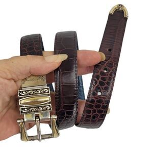 Vintage 80's reversible 2 in 1 colored leather crocodile embossed blue and burgundy brown 1" silver ornate buckle detailed belt by Brighton.