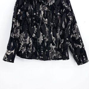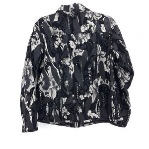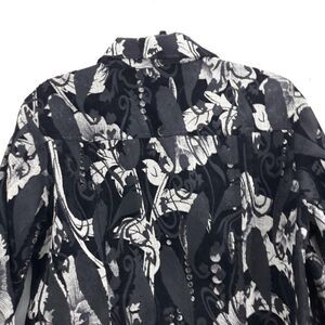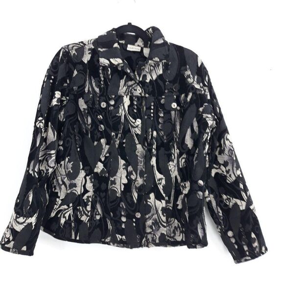 Black and gray abstract tapestry brocade jacquard shaket jacket collared button down long sleeve breast pockets by Chico's