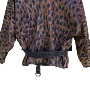 Vintage 80's Tarazzia wearable art leather bomber jacket upcycled one of a kind Hand Painted Leopard by artist KB. Hand painting took 27 hours and was done 20 years ago. Split lapel, shoulder pads, batwing belted leather jacket.