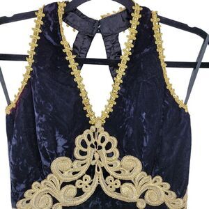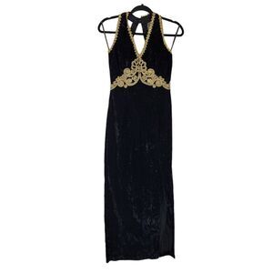 Black velvet metallic gold embroidered applique rickrack sleeveless plunging V strappy back longline gown with front sexy side slit vintage 80's Jessica McClintock for Dillard's dress.