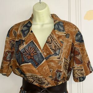 Vintage late 80s/early 90s Positive Attitude Brown, Tan & Blue Wrap Look Tropical Print Short sleeve rayon knee length Dress with original belt