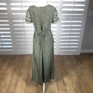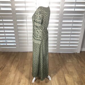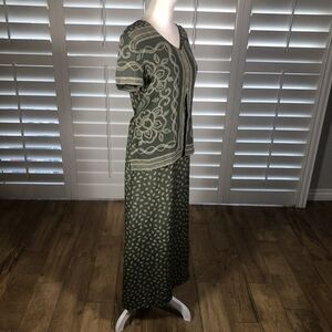Vtg 90s Casual Corner Annex Olive Green Rayon Apron Dress 8 Midi Geo Print