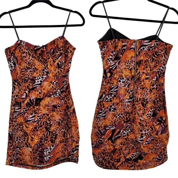 90's vintage convertible ribbon strap or strapless sweetheart multimedia animal print patchwork stretch mini bodycon dress by City Triangles.