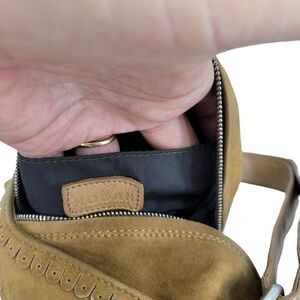 Light camel colored vintage leather mini baguette unique Hippie Western Native 4 pocket adjustable belt strap studded scallop fringe shoulder bag by Hogan. 2 zipper pockets, 2 open pockets and 1 small interior pocket.