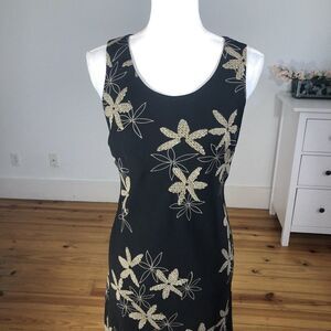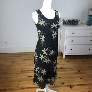 Vintage 90's Sheri Martin black floral sleeveless chiffon sheath dress. Tan flowers on black chiffon. Fully lined. Body skimming, figure flattering. No flaws or stains. Size 8.